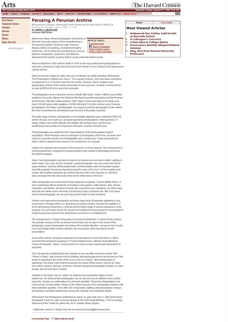 Por primera vez el público norteamericano podrá ver imágenes del perfil humano de los habitantes de Ayacucho, Perú. La exhibición fue tomada de los archivos del fotógrafo Baldomero Alejos Bautista y organizada por el Centro de Estudios Latinoamericanos David Rockefeller de la Universidad de Harvard. Exposición Fotográfica de Baldomero Alejos Bautista en el Centro Latinoamericanos de Estudios y la Casa de la Cultura